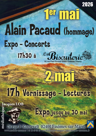 La médiathèque Jacques Lob en partenariat avec la Biscuiterie, les Gode Morningue, Le Guet’Apens, la Cie l’Echappée, Le théâtre de La Mascara, et beaucoup d’autres, rendent hommage à Alain Pacaud, artiste et poète militant du Sud de l’Aisne, lors d’une exposition et d’un week-end exceptionnel, le 1er et 2 mai, mêlant musique, théâtre, ripailles et surprises !