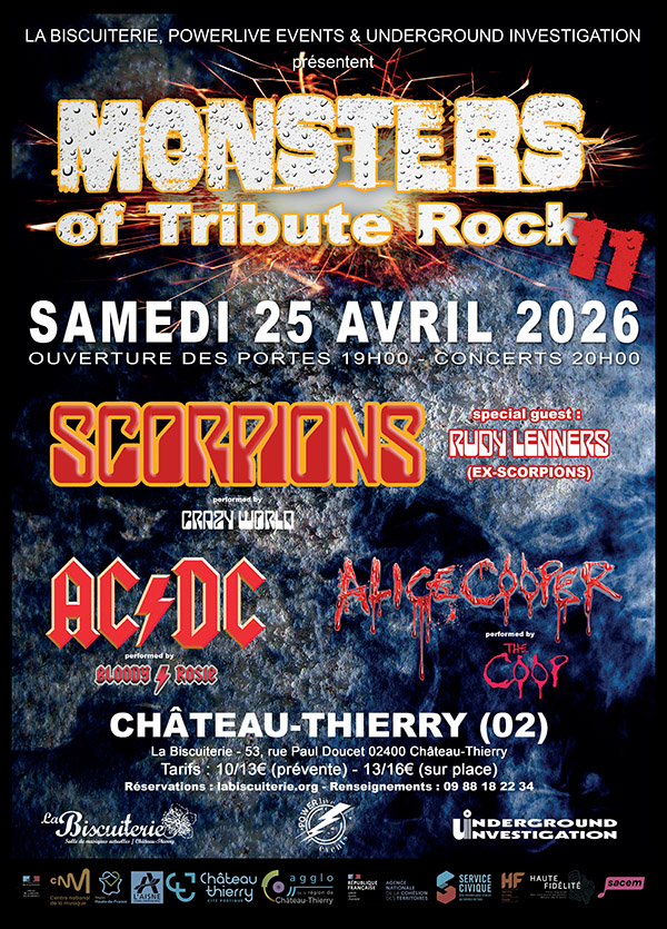 Rendez-vous incontournable et plébiscité depuis maintenant trois saisons, la soirée MONSTERS OF TRIBUTE ROCK rend cette année hommage à trois mastodontes de l’histoire du rock : SCORPIONS, AC/DC et ALICE COOPER.