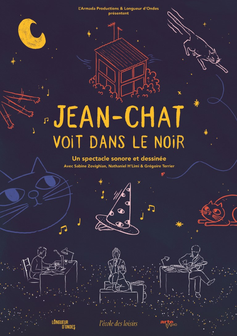 Jean-Chat voit dans le noir est une histoire initialement racontée dans une fiction ARTE Radio qui prend ici la forme d’un spectacle musical dessiné en direct. On y suit les aventures d’un petit garçon à la recherche de son chat au cœur de la nuit. Un soir, Hector décide de partir à la recherche de Jean-Chat, son fidèle compagnon disparu un peu plus tôt dans l’après-midi. Ses pas l’emmènent au détour d’une ruelle, en haut d’un arbre géant et jusqu’au milieu d’une guinguette. Cette quête nocturne est portée par une création sonore qui mêle compositions électro-acoustiques et bruitages et chansons. L’histoire s’esquisse aussi en direct, en dialogue étroit avec les sons. Les coups de pinceaux, de calques et de crayons laissent l’imaginaire les animer. À travers leur univers bleuté aux touches dorées et aux ambiances feutrées, le trio nous invite à devenir chat, à apprivoiser l’écoute et l’obscurité. C’est du théâtre radiophonique, un conte sonore et dessiné, un livre audio en trois dimensions mais c’est surtout le récit fantastique et poétique d’un petit garçon qui a perdu son chat.